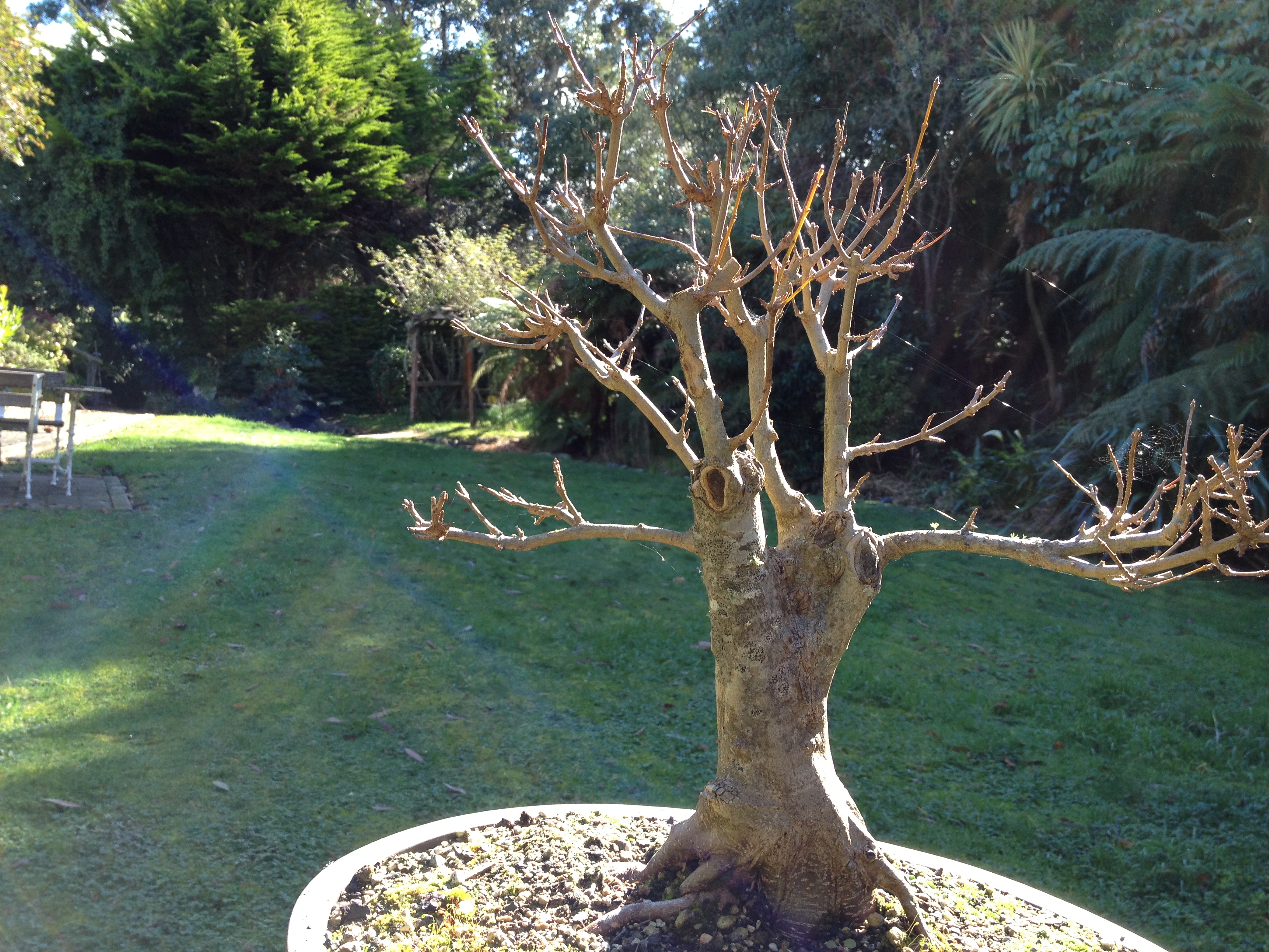 There is now more width to the tree, but the vertical branches making up the apex have not been sorted yet. That is the next phase of development, a repot come spring and that will be in a smaller, more appropriate pot.