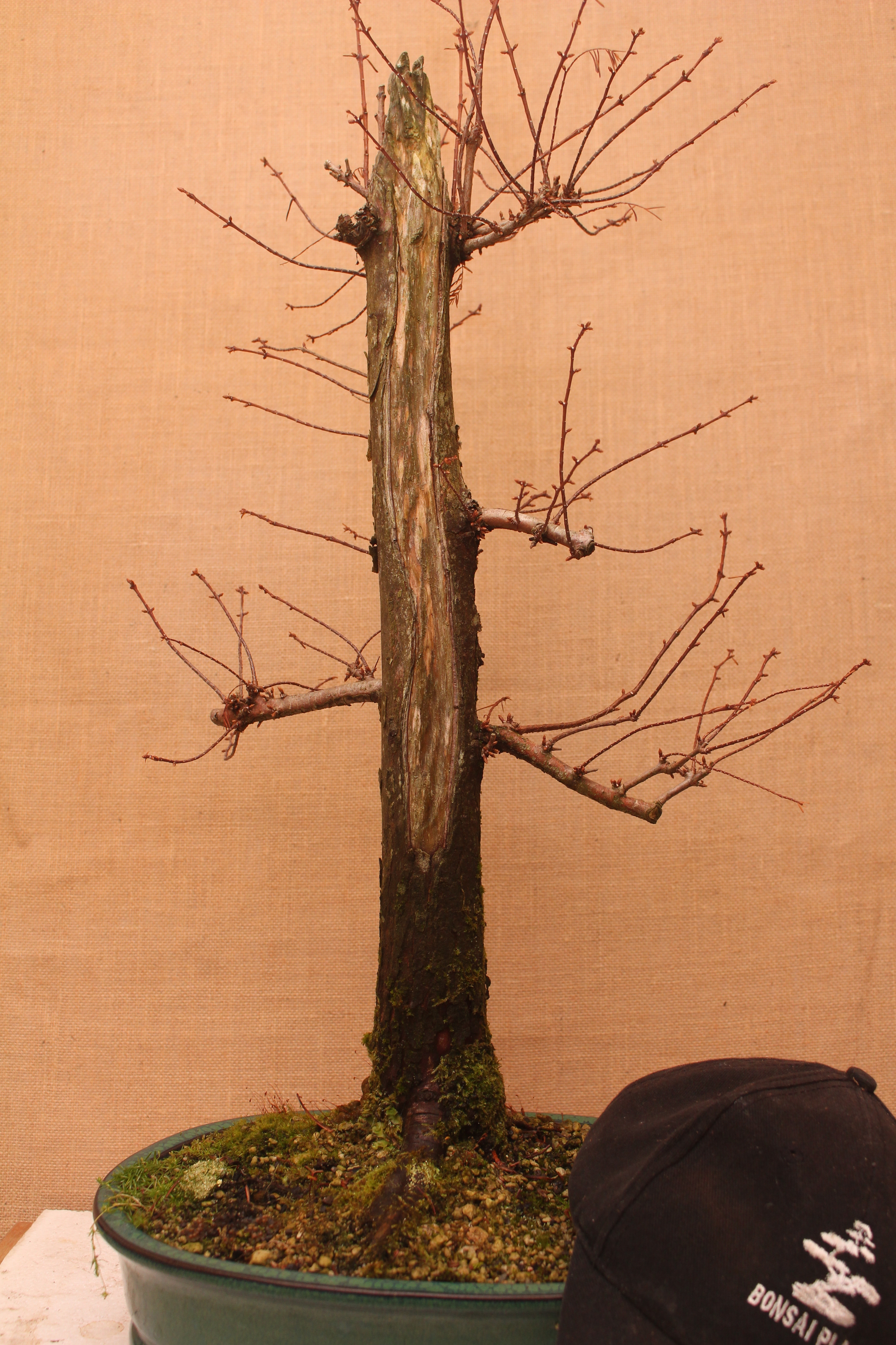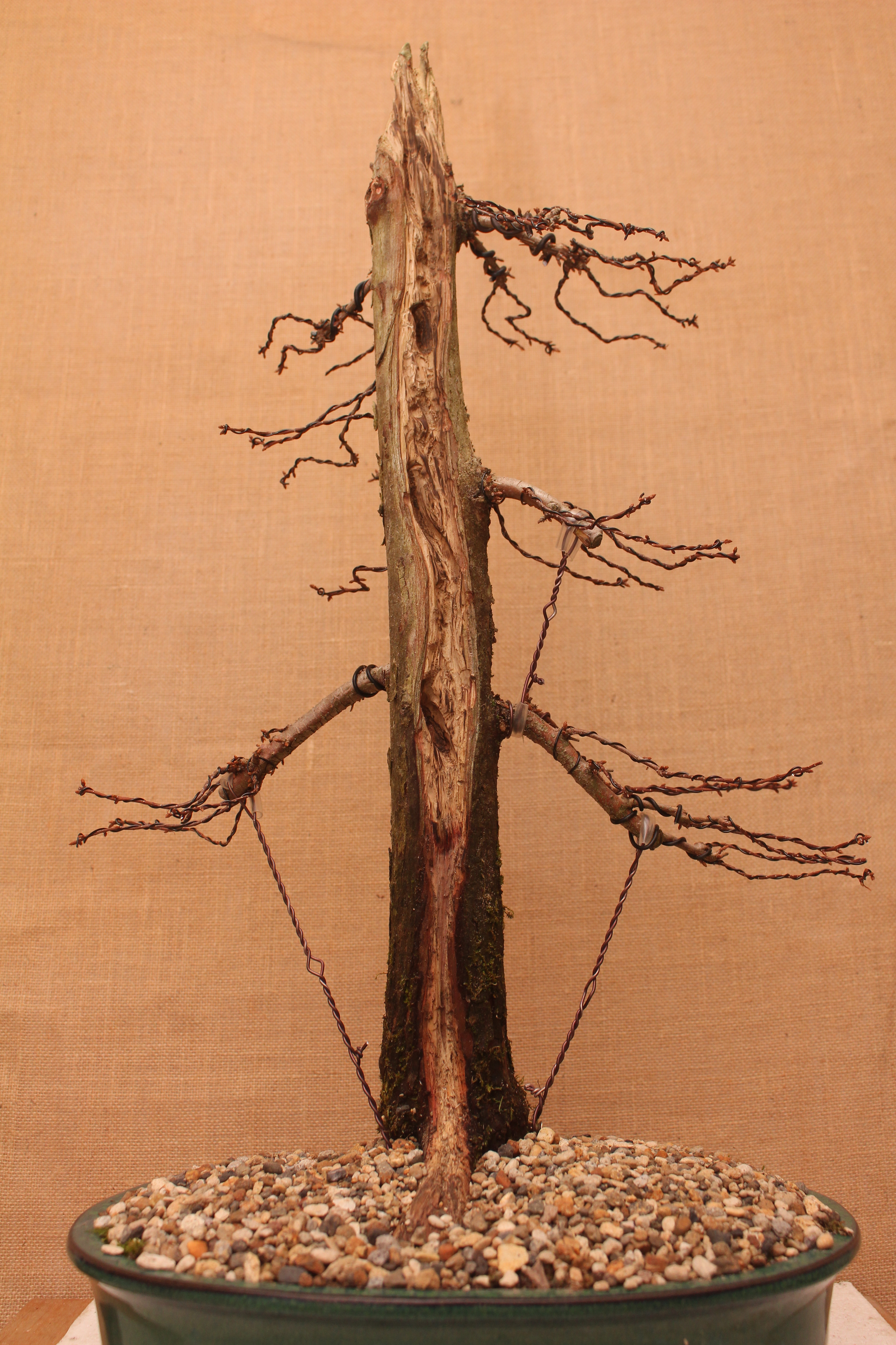 Two years ago this was a two and a half meter nursery tree. I chopped it down to about a meter at the nursery as I could not get it in my car. Then the journey began. It was potted in a Bonsai pot and left to grow, It had a light prune and a bit of a carve a year before and today it was time to revisit the shari and to get some wiring done. The buds are very fragile this time of year and great care has to be taken to not break them off.