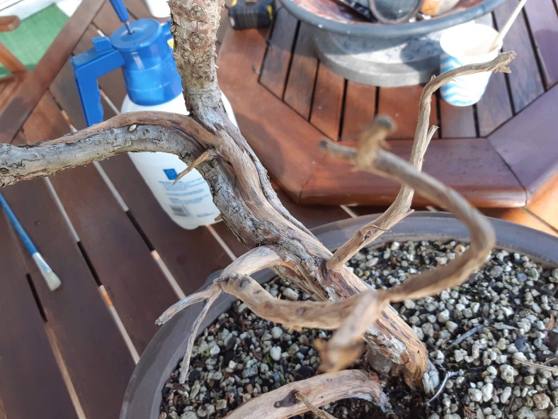 As most of the branches were leaning towards the left, it was an easy decision to let the flow all go to that side. A few more weak branches were cut and jinned. This job took about two hours with the help of a knife and a Dremel. The tree was left overnight and lime sulphur applied the following day.