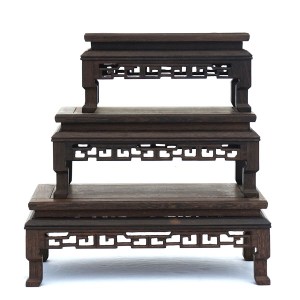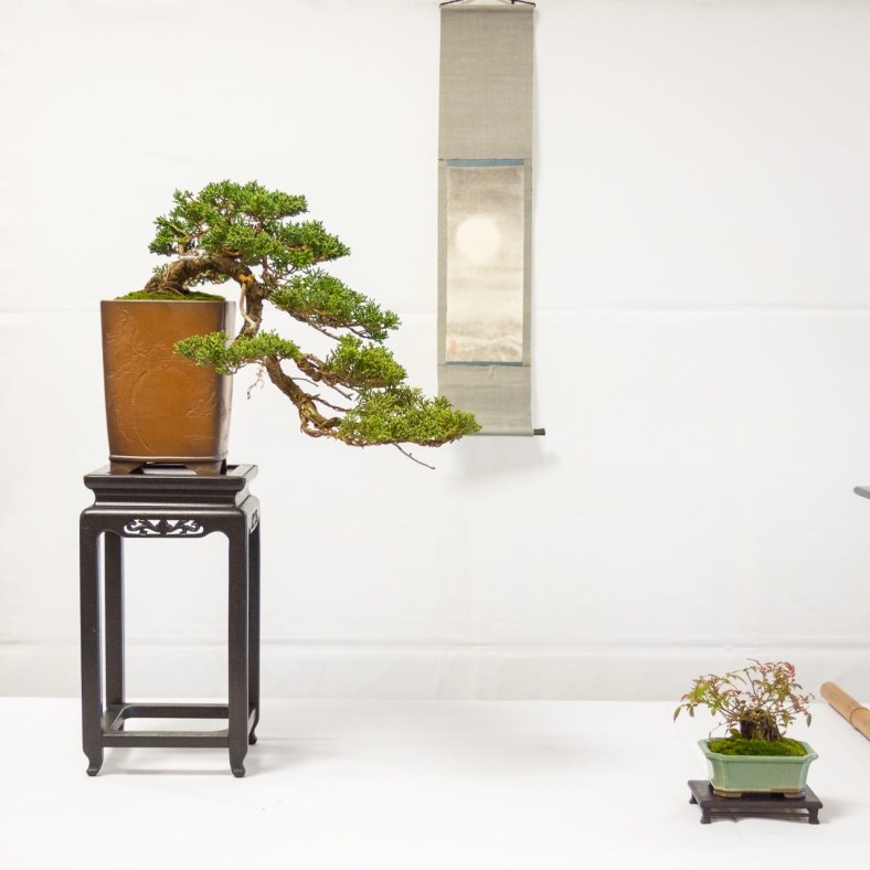 All components making up the display must be clean and in good condition. The so-called three-point display technique will compliment your tree. This usually consists of the tree on a stand, an accent tree or plant and a scroll. One of the two non-tree elements could be a Suiseki. The dimensions and placing of the three elements are crucial to get a view of one, but to still emphasise the tree as the main focal point. My best advice with this is to have a few stands, scrolls, accent plants and even Suiseki at the ready and to try different combinations.