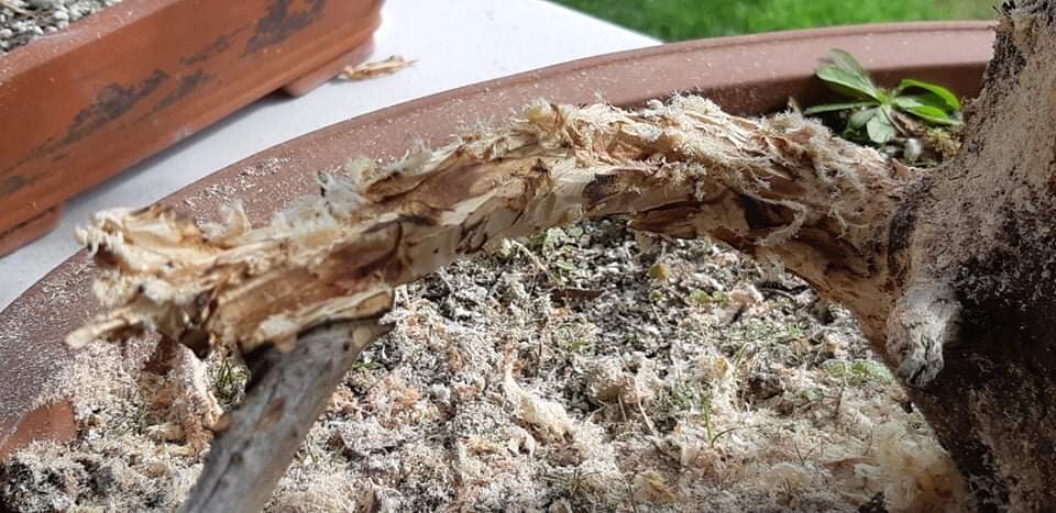 Carving is usually done to create or enhance jin, uro (holes), shari (stripped bark) or getting rid of areas where large branches were removed. In this case a large branch, about one inch thickness, had to be removed and it was decided to leave a 15cm piece of it and sculpt a jin (deadwood) out of it.