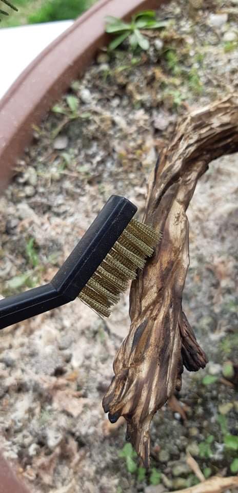 I use a die grinder with a carving bit to remove material fast and to roughly shape the dead straight branch by making grooves in curves and alternating the depth of the grooves. Once this is done I burn the jin to get rid of wood fibres and then repeat the process with the trusted Dremel and a smaller carving bit.