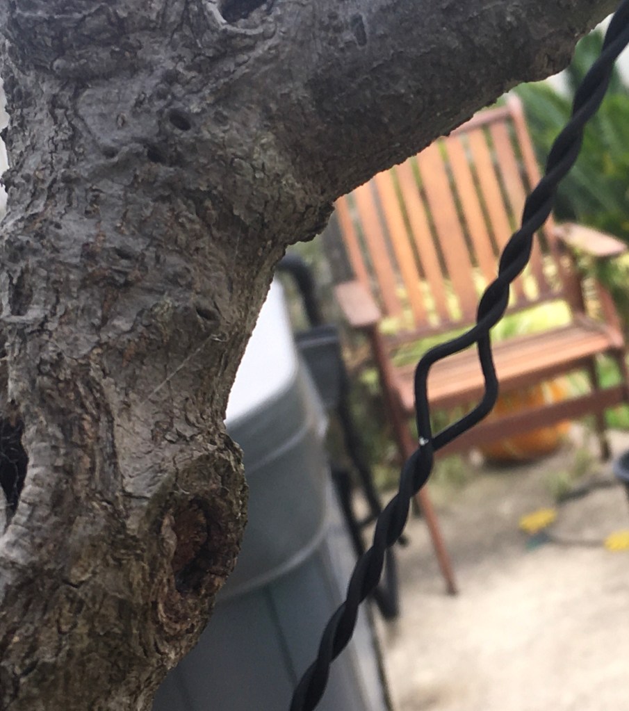 I apply a guy wire if I need to pull a branch down or sideways on these brittle branches. A screw is placed at the bottom of the trunk, preferably under soil level or as close as possible to it. The hole left once removed will close quickly.