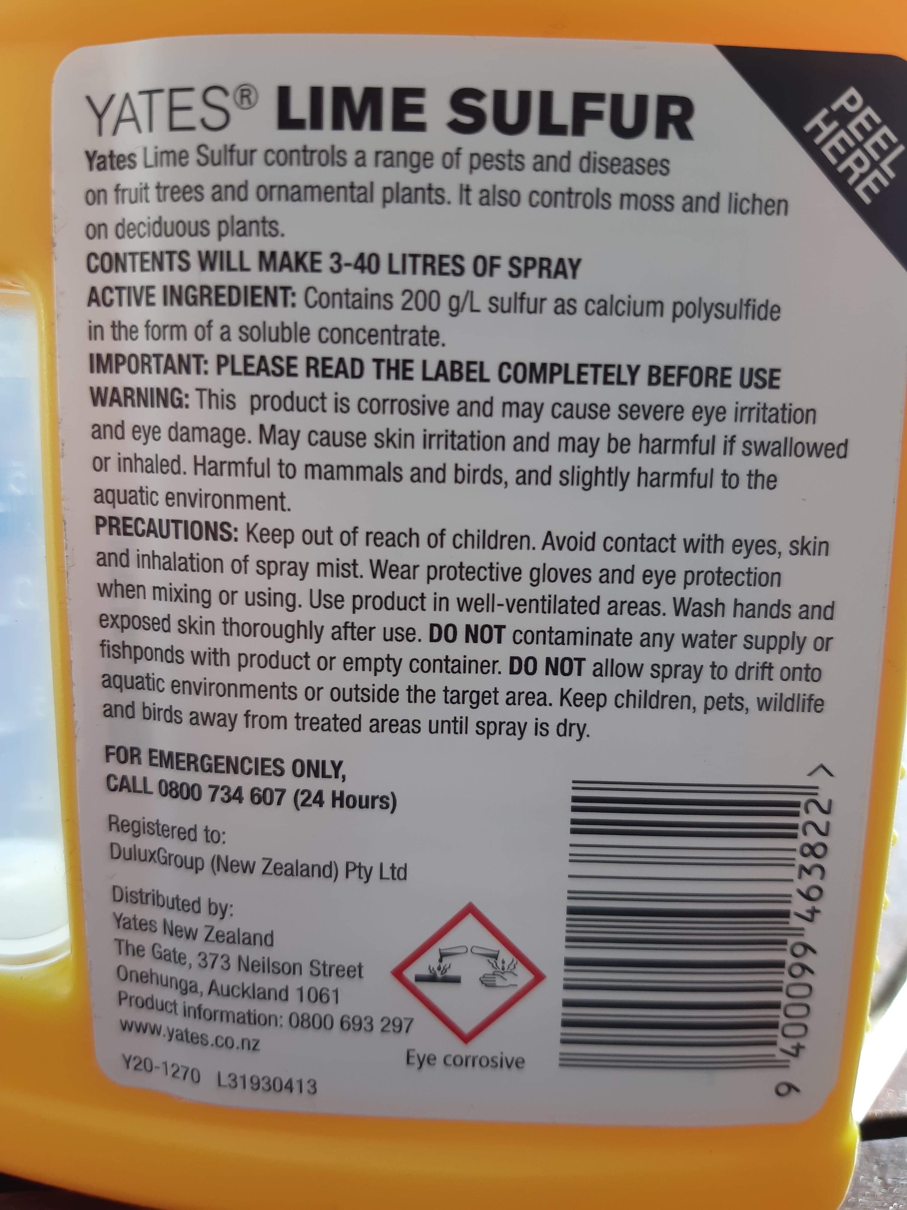 | Yates Lime Sulfur | 200g/L sulfur as calcium polysulphide | Multi-purpose that controls a range of pests and diseases, moss and lichens. Largely for preventative use. | |