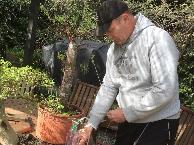 During my healing after surgery and especially during the radiation phase, I regularly interacted with my trees, and as it was during Spring and Early Summer, there was a lot to do. I did miss the repotting opportunity during that time as I did not think it was wise to work too much with soil-filled bacteria and other creepy crawlies around. Most of the work was around pruning trees, styling, inclusive of wiring and also removing wire. These are repetitive actions and on a large tree can take up to three hours. Due to the radiation effects, I had to break lengthy jobs up into shorter stints to not over burden myself. Smaller trees I could move myself, but my wife had to help with the larger ones. I had a wound drain hanging out of my side and this could become tricky with the plastic drain tube and very sharp pruning scissors snipping away.