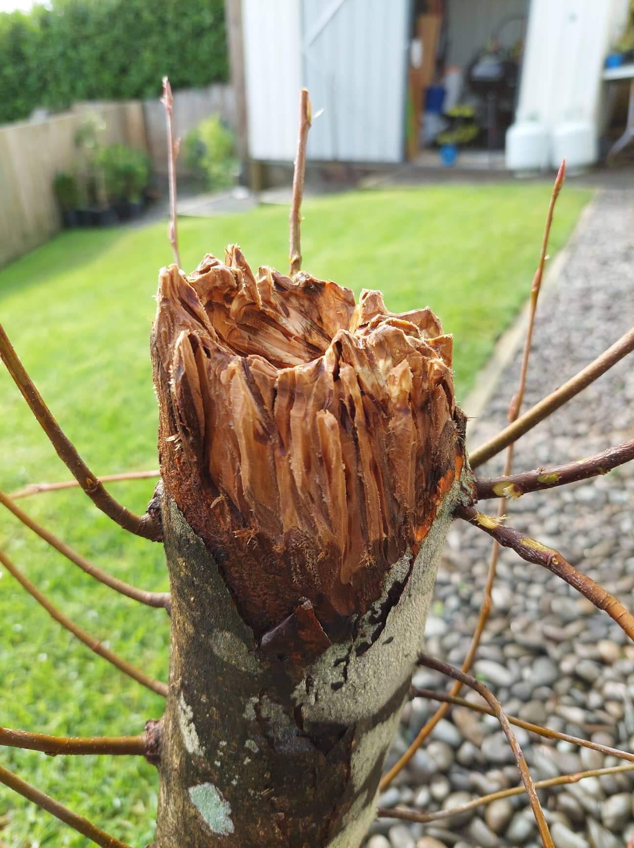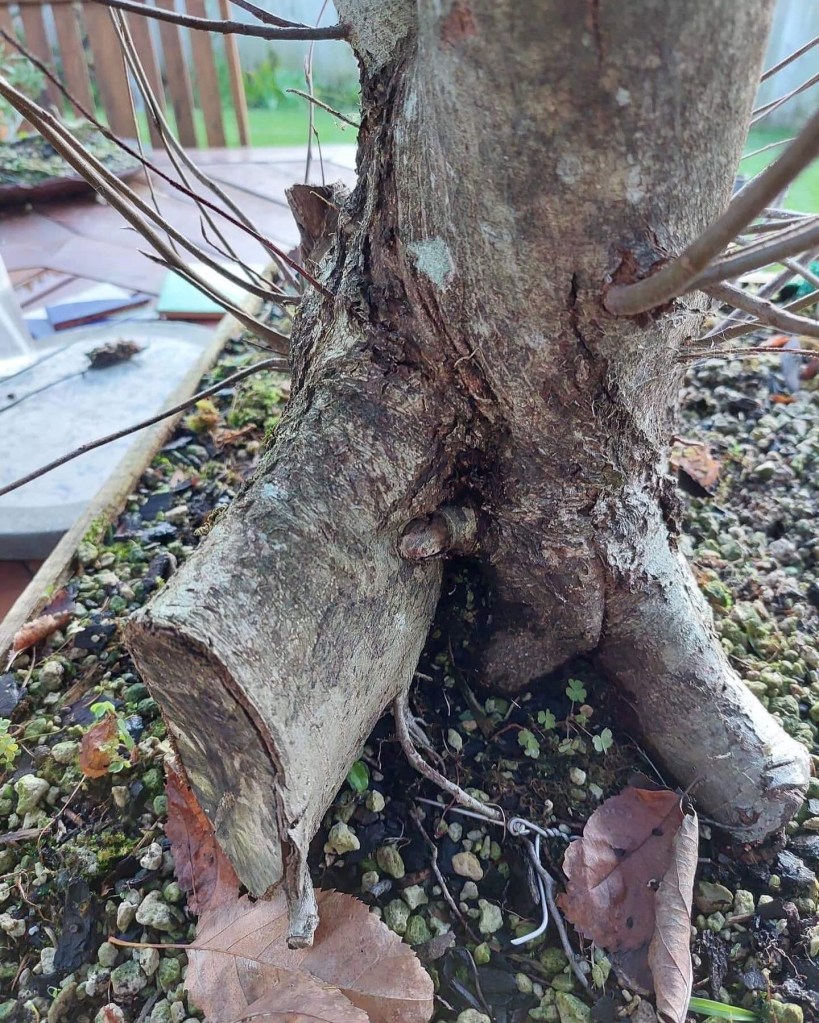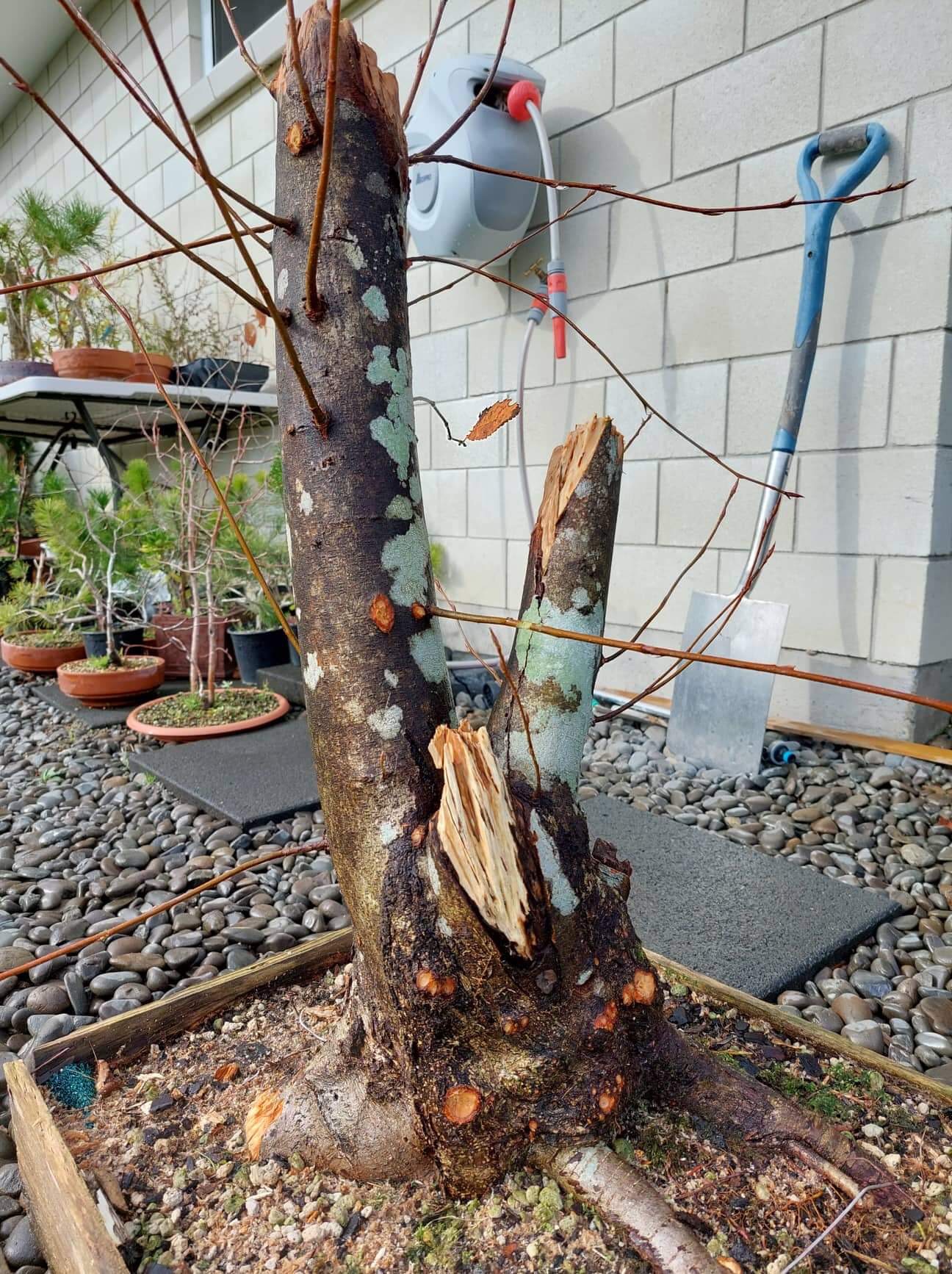 Aftercare and the future: the tree will now be placed in a sheltered spot and remain there for at least a year. Fertilisation, watering, checking on the wire and weeding is the most excitement this tree will see for a long time. When the time is right, the wire will be removed and the Jin will be further developed. That will just be some detail work, inclusive of using fine carving tools, torching it and lime sulphur treatment. The tree will also go into a Bonsai pot once the growth is strong.